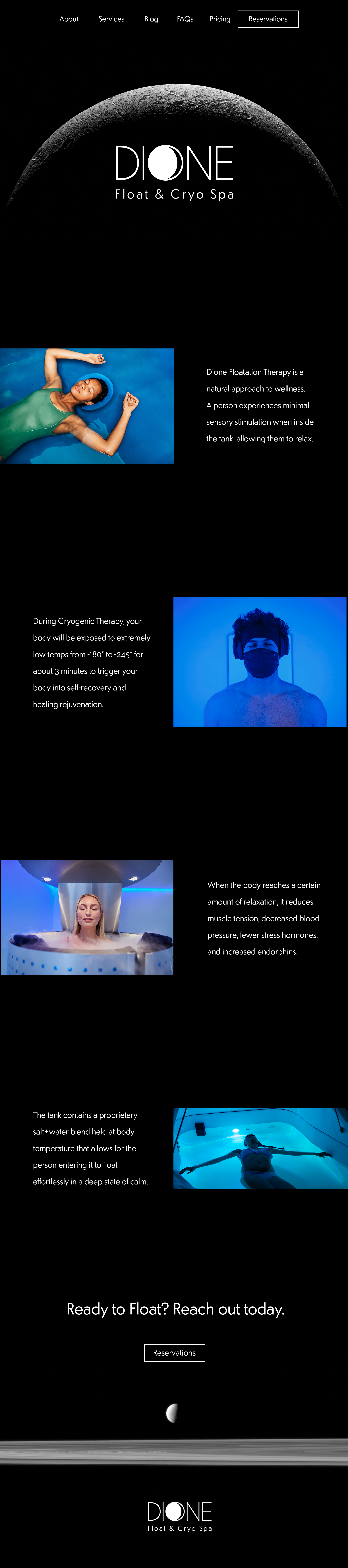 Concept for a spa specializing in flotation therapy and cryogenic therapy (aka cold therapy.) Named after one of Saturn's coldest moons, Dione Float & Cryo Spa requires a logo, sign design, and website design.